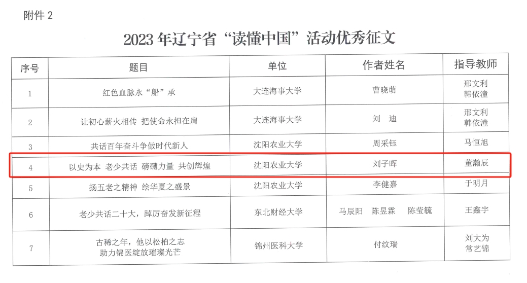 近日,在辽宁省“读懂中国”活动中,我院2021级农业工程与信息技术专业硕士研究生刘子晖撰写的《以史为本 老少共话 磅礴力量 共创辉煌》一文荣获优秀征文奖。